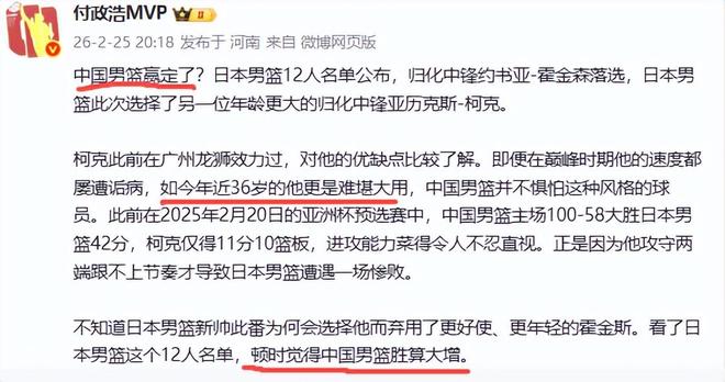 而柯克在2025年2月的亚洲杯预选赛日本男篮58-100惨败给中国男篮的比赛中表现低迷,只得到11分10篮板。事实上柯克原来在广州队效力过,现在已36岁。付政浩 之所以这么乐观,认为日本队主教练用柯克取代霍金斯是一个昏招,他表示柯克又老又慢,有用人唯亲的嫌疑。